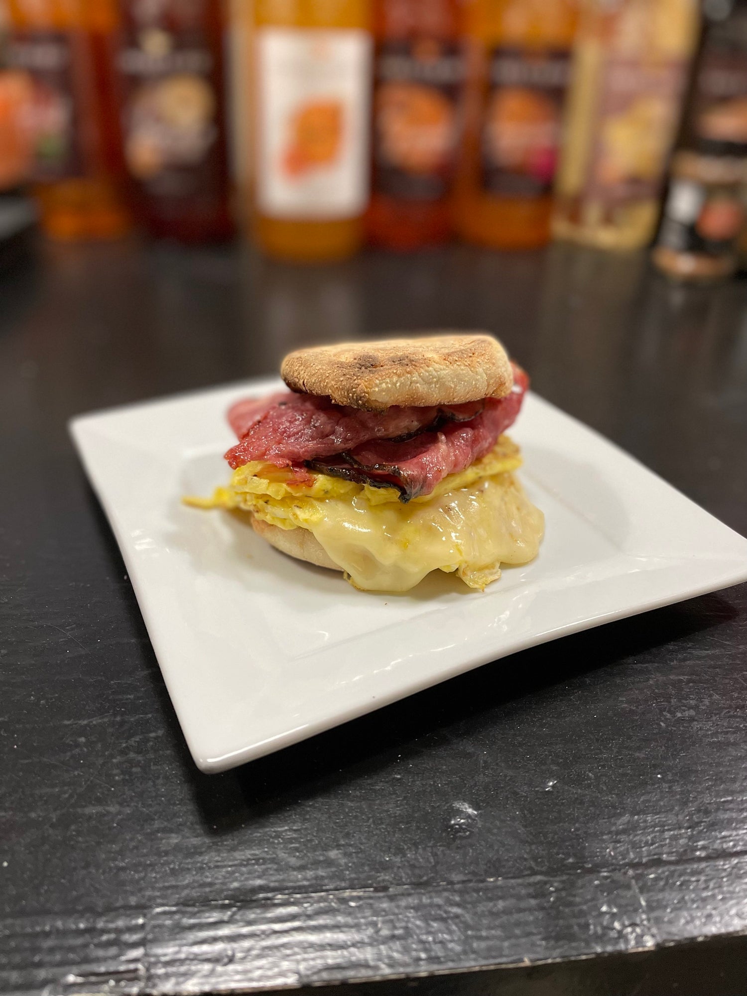 Montreal smoked meat, white cheddar, mustard & egg on an English muffin.