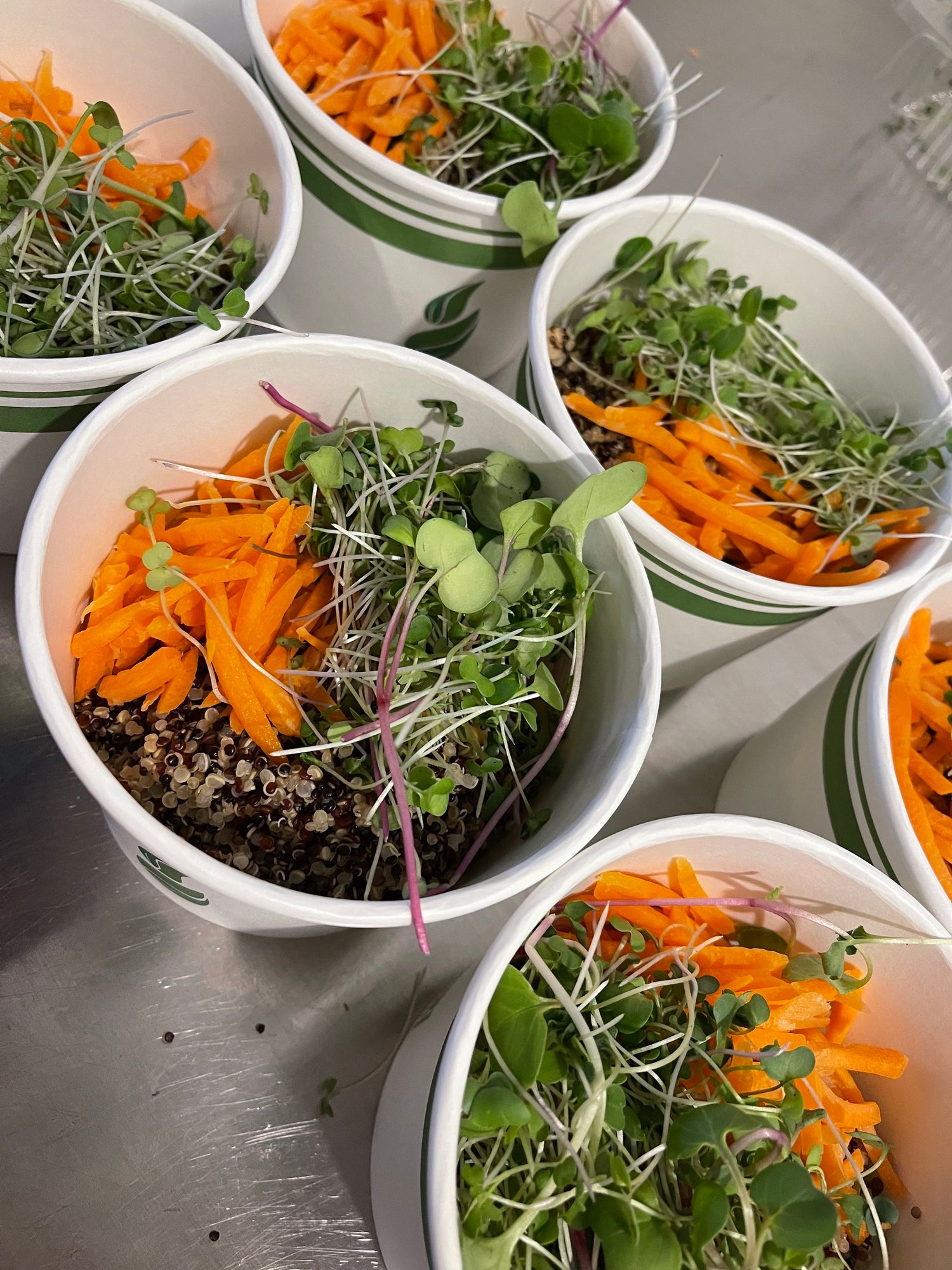 A seasoned quinoa base topped with diced yellow peppers, shredded carrots, local microgreens, roasted pumpkin seeds, and a creamy herb dressing.